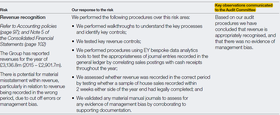 Ponemos el foco en el informe de algunas empresas británicas, que han sido las primeras en emitir informes con KAM. Concretamente, nos fijamos que en el informe de de auditoría de las cuentas anuales consolidadas de PERSIMMON PLC (empresa inmobiliaria británica), del ejercicio 2016, en su informe de auditoría, las KAM se manifiestan con una estructura en 3 columnas, tal y como se ve en la siguiente imagen: