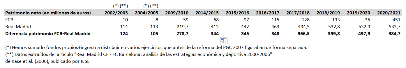 Aunque a priori el patrimonio neto es el “residuo” o diferencia entre activos y pasivos, en el caso de estos dos clubes profesionales arroja una información que sin duda resulta de mucho interés, como veremos a continuación